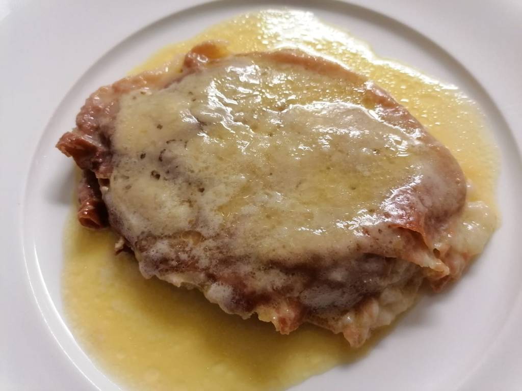 Cotoletta alla bolognese is quite the tasty dish; it’s made with veal meat (not chicken!), breaded, covered with ham (which should be prosciutto crudo) and Parmigiano Reggiano cheese, cut into very thin flakes or grated using a grater with large holes.